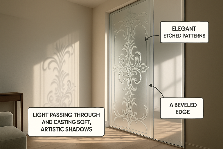 - Furniture Accents: From glass tabletops to back-shelving and cabinetry panels, etched or beveled glass adds drama and luminosity to functional pieces.